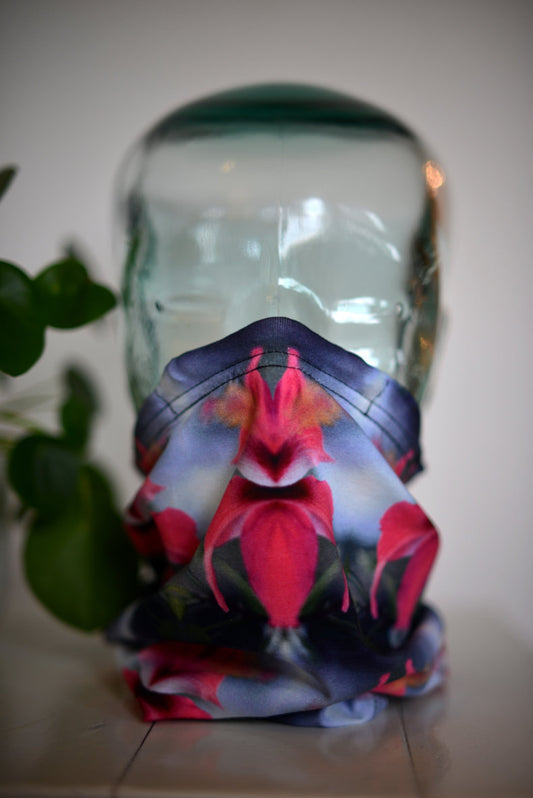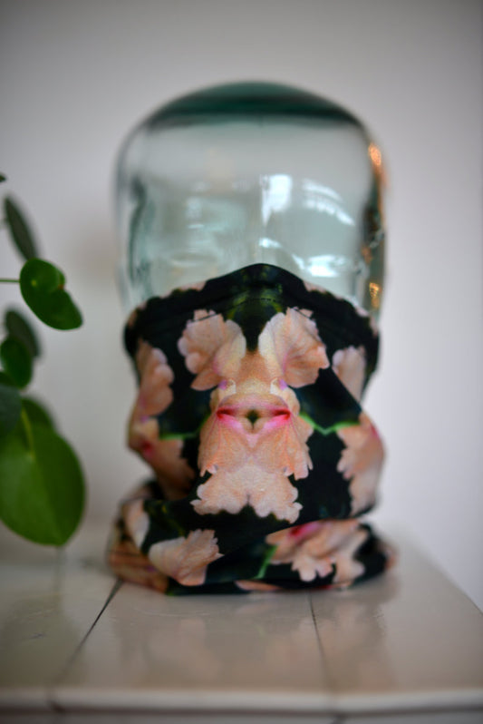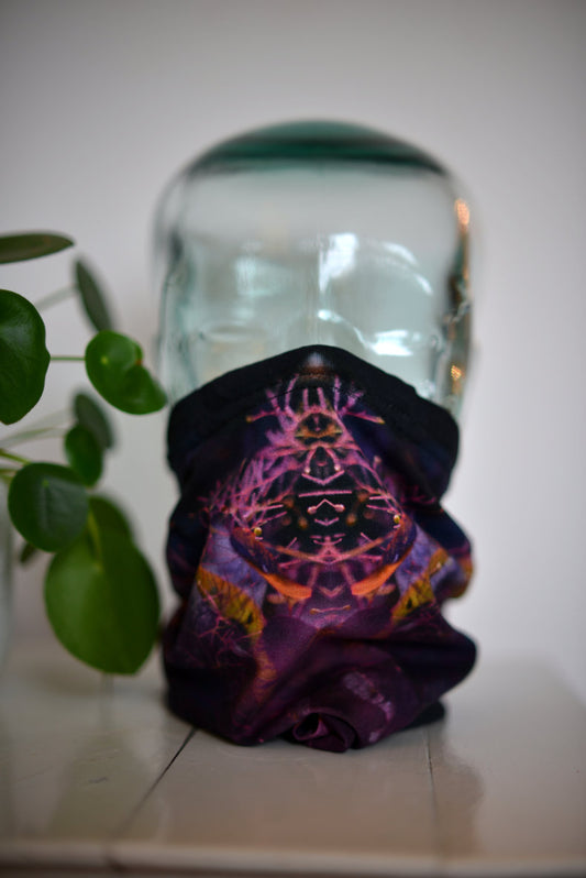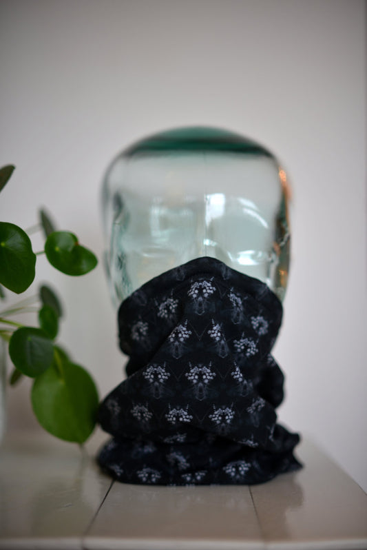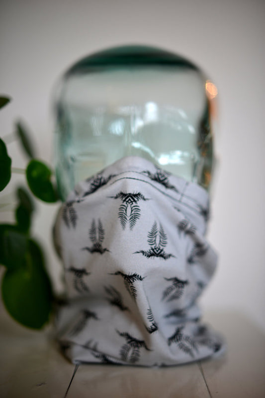 Washable, reusable filter hidden in a soft organic cotton snood.